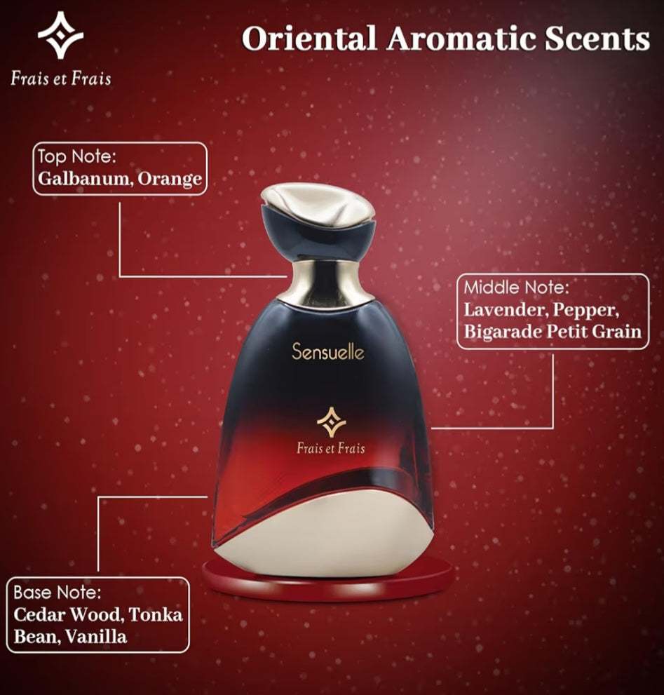 Frais Et Frais Sensuelle es una fragancia oriental-aromática, descrita como audaz y sofisticada, que combina notas frescas de naranja y galbano con un corazón especiado de lavanda, pimienta y ajenjo, asentándose en una base cálida de cedro, haba tonka, vainilla y musgo, creando una experiencia olfativa profunda y duradera, inspirada en fragancias de lujo pero asequible, perfecta para quienes buscan una estela potente y sensual.