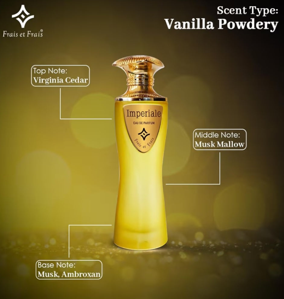 Frais Et Frais Impériale es una fragancia unisex de lujo, descrita como un perfumevainillado y empolvado, que evoca elegancia y calidez, inspirada en la popular fragancia Vanilla Powder de Matière Première. Combina notas de madera de Cedro de Virginia, la suavidad de la Ambarina Almizclera (Musk Mallow) y una base sensual de Almizcle y Ambroxan, creando un aroma sofisticado, powdery y amaderado, ideal para quienes buscan una experiencia olfativa rica y duradera.